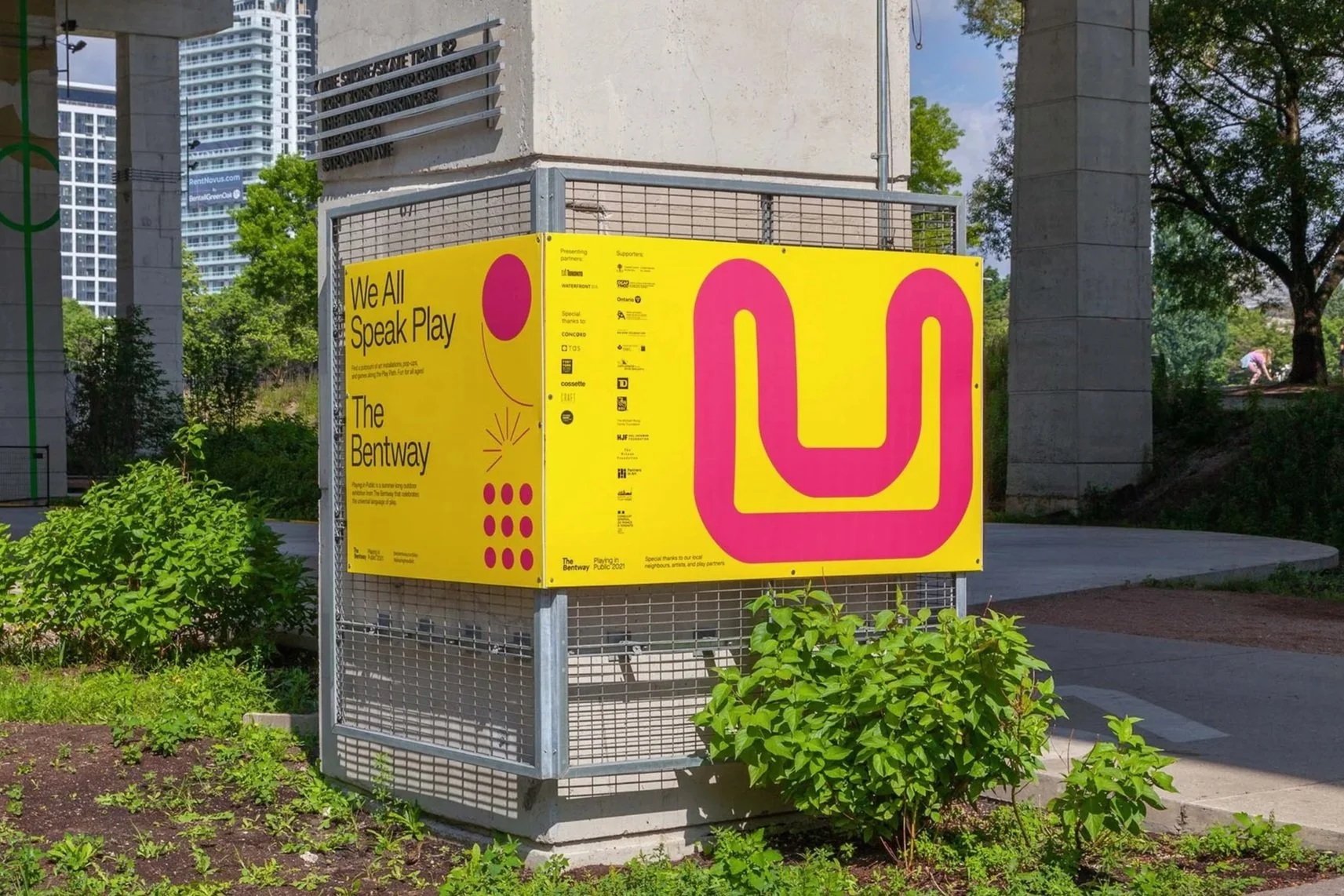 The Bentway is a growing events and shared public space hidden under the Gardiner Expressway in Toronto. In 2021, they approached the design team at Cossette to develop an identity for their summer-long art exhibition, Playing in Public, which looked at how space shapes play, how a city can change play, and how play changes our city.