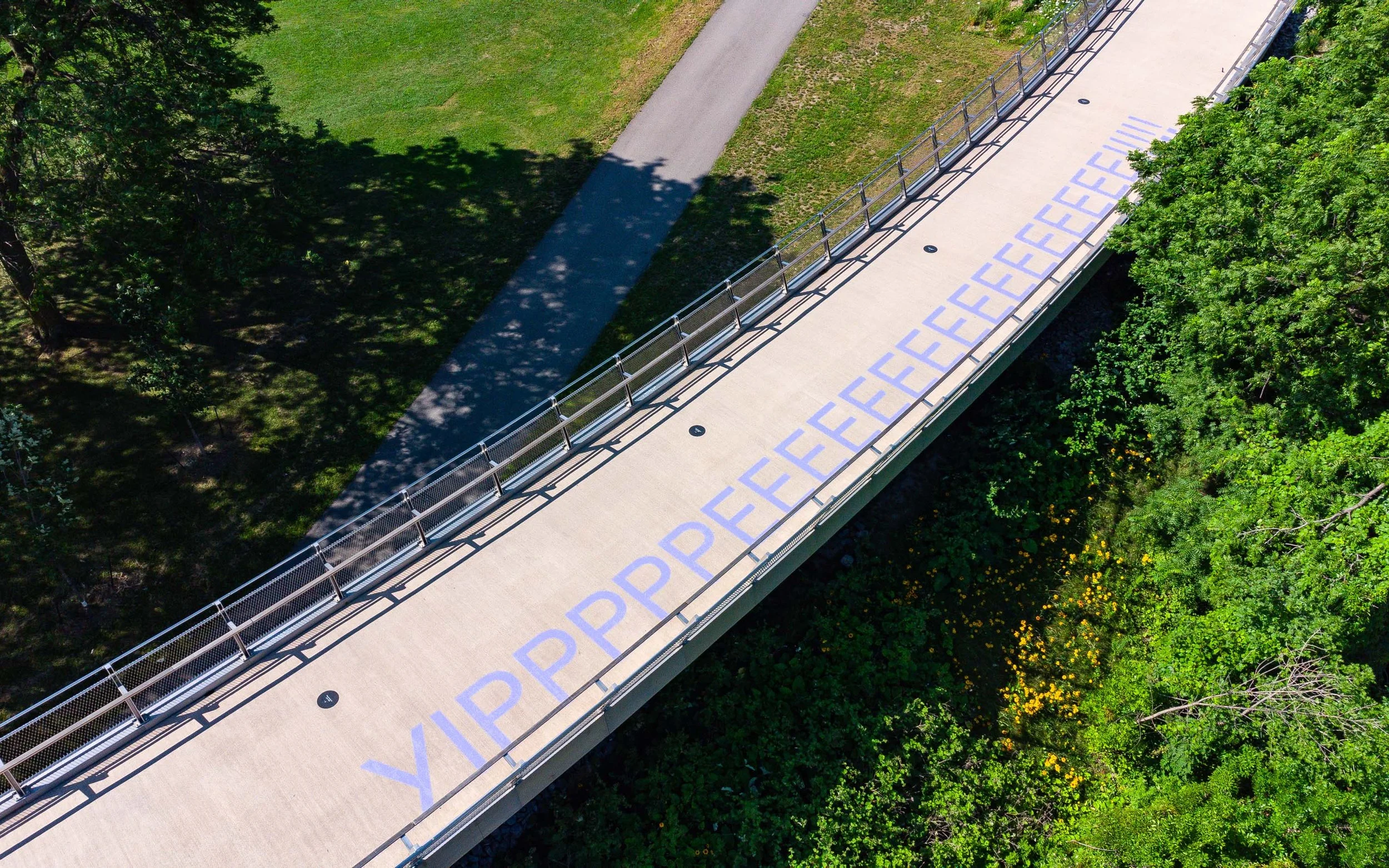 We made use of the unusual placements we had within the space, from ramps and staircases to park paths. We even took advantage of height and perspective as a mode of communication. Many of the neighbours we were inviting to the space lived in the often 50+ story condo buildings which surrounded the site. We created enormous signs on the ground which, when viewed from balconies above, became invitations to come and play.